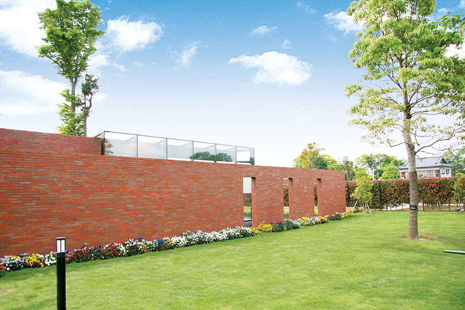 手入れの行き届いた緑鮮やかなグリーンウォールを配し、素焼きレンガ8万枚にもおよぶレンガウォールに包まれた憩いの空間。