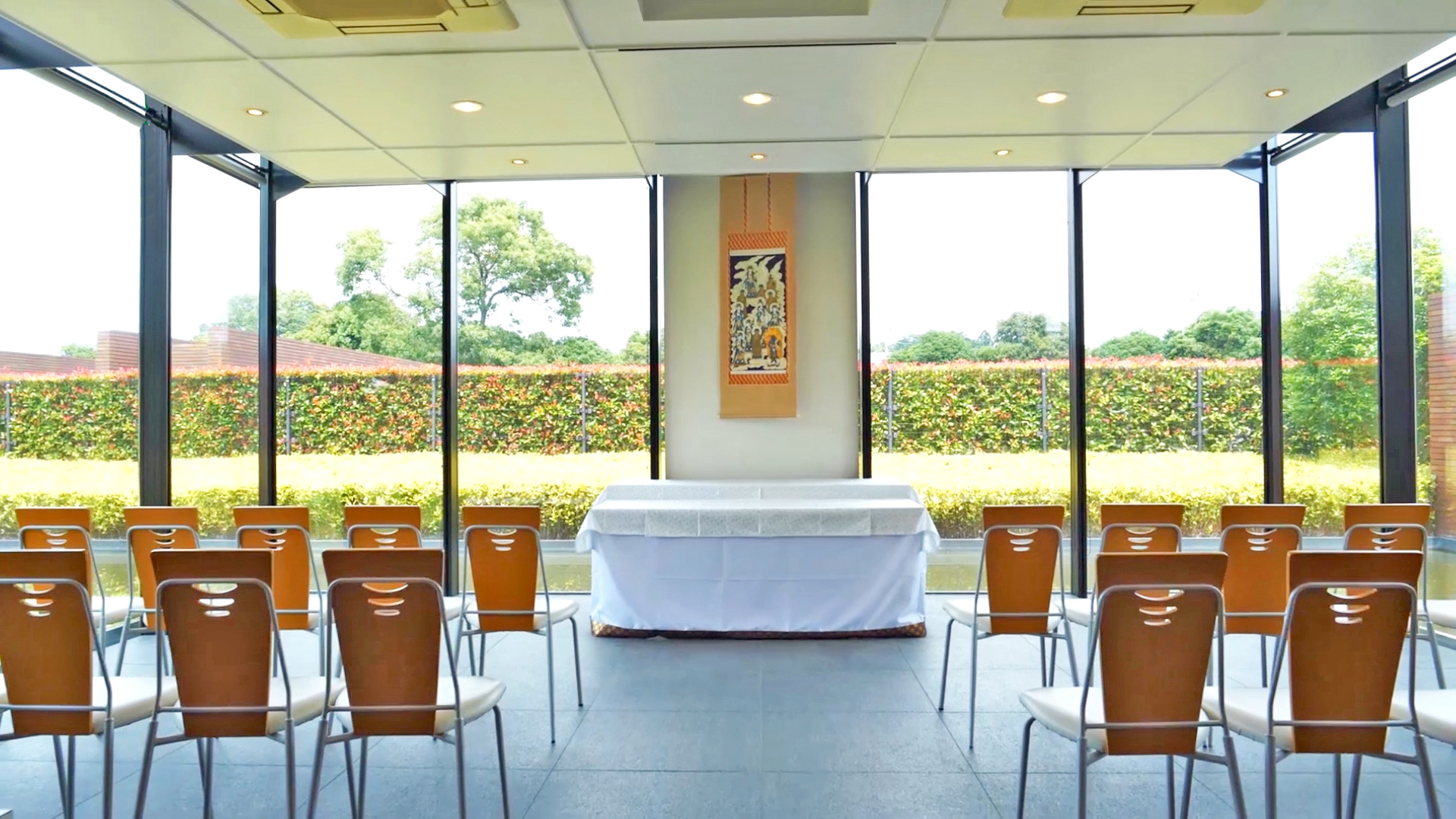 清涼な水の流れと豊かな芝生を眺める法要室は、当園でお墓をお求めの方なら、ご希望に応じて各種ご葬儀を承ります。また法事や会食などの催事にもご利用いただけます。